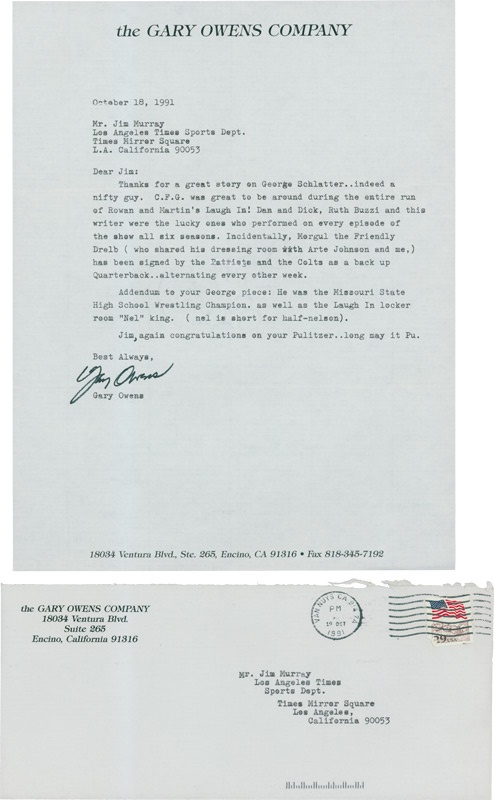 Hoot of a letter dated Oct. 18, 1991 by "Laugh-In" announcer Gary Owens complimenting Murray for a column about the show's producer George Schlatter, whom he points out was once a Missouri state wrestling champ. Ends, "Jim, again contratulations on your Pulitzer...long may it Pu. Best always, Gary Owens." Signature in black marker NRMT as is the 8.5 x 11" letter on "The Gary Owens Company" stationery, w/2 light folds.