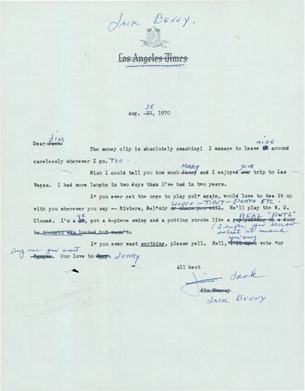 Wonderfully clever Jack Benny letter dated Aug. 28, 1971 (3 years prior to his death) that uses a letter Murray had sent to him the day before relating his vacation travels -- with Benny crossing out certain words and replacing them with his own handwritten ones detailing his vacation. One change was deleting "a guy" with "real putz (I hope you know what it means)." L.A. Times logo at top and Murray's typed name at bottom are crossed out and "Jack Benny" written in blue pen. 8.5 x 11" letter is EX with a few small rips.