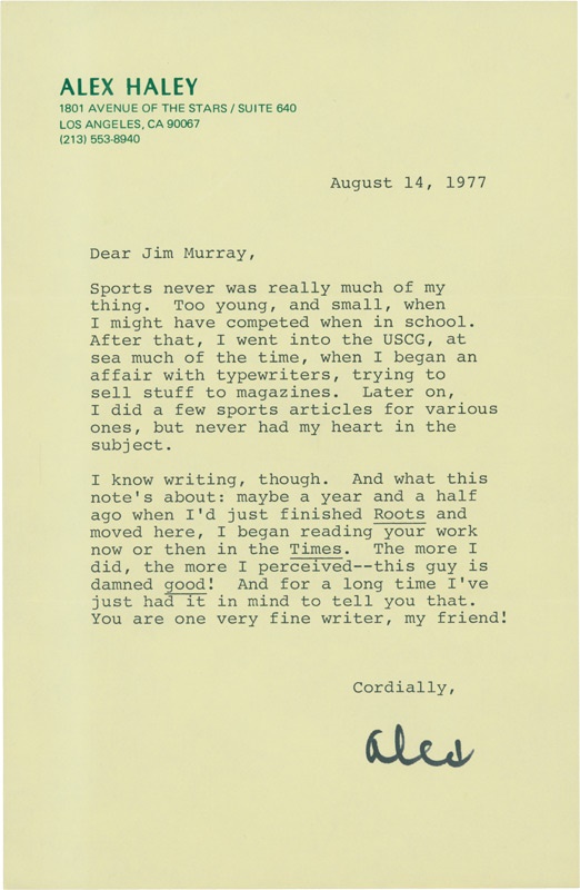 Haley tells Murray in this Aug. 14, 1977 letter that "when I'd just finished writing Roots...I began reading your work [and] the more I did, the more I perceived -- this guy is damned good." Letter typed on Haley stationery is especially noteworthy for Haley relating "Sports never was really much of my thing. Too young, and small, when I might have competed in school." He then tells of his education and "affair with typewriters." Signed, "Cordially, Alex," the name in black marker. 5.5 x 8.5" and NRMT w/2 light folds.