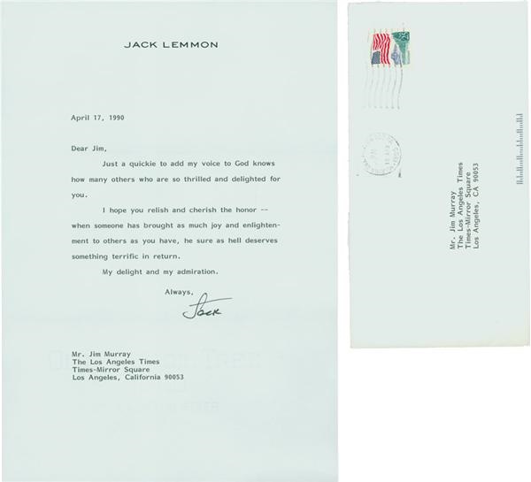 The multi-Oscar-winning actor enthusiatically congratulated Murray on his Pulitzer Prize in an April 17, 1990 letter typed on personal stationery, writing that he was "thrilled and delighted for you" and that Murray "sure as hell deserves something terrific." Signed, "Always, Jack," the name in black ink. 7 x 10.5" letter on snow white paper is NRMT with 2 light folds and comes with the personalized envelope it was mailed in.