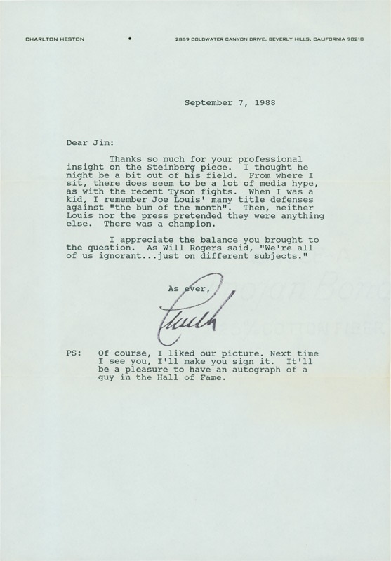 Frank give and take between Murray and Charlton Heston, with "Moses" venting in a Sept. 7, 1988 typed letter (7 x 10.5") about a "Steinberg piece" and "media hype" in sports, "as with the recent Tyson fights." Handwritten Murray letter on L.A. Times stationery (8.5 x 11") asks Heston to give a reference to a young theater student and in response to a Heston letter about racism in sports, opines "the people closest to the soil excel in sports...In fact, American blacks are increasingly edged out by island blacks (Dominican, Puerto Rico, etc.)." Heston signed "Chuck", Murray with his full name. Both letters NRMT.
