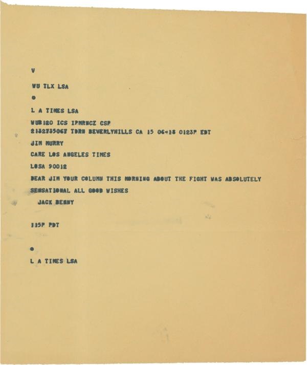 Jack Benny was so eager to praise a Jim Murray column on a big fight that he sent this Western Union telegram, which reads: "Dear Jim, Your column this morning about the fight was absolutely sensational. All good wishes. Jack Benny." 8 x 11" telegram is G-VG with some ink bleeding and a rip here and there along the edges. Top edge serrated from being ripped off the wire.