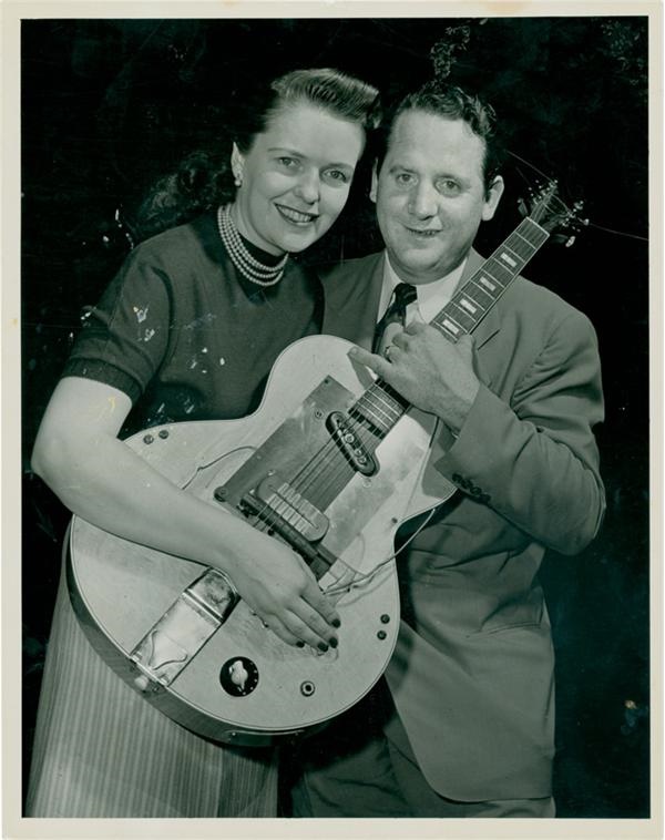 He may have looked like a square, but without Les Paul's work in the '50s and '50s there would have been no Hendrix, Clapton or Richards -- hell, no rock and roll. This great 8 x 10 of the guitar legend with his wife, singer Mary Ford, in the '50s, shows both clutching the famous Gibson electric guitar he created, still the most popular guitar brand in the world. Back is stamped "Rothschild Photo Los Angeles." Photo is NRMT. Hail, hail Les Paul!