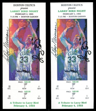 Pair of enormous (4.5x11") unused tickets would have allowed two bigwigs into Boston Garden to honor the Celtic great. Instead they were retained in NRMT condition and signed in perfect black sharpie by both Bird and LeRoy Neiman, the man whose artwork dominates the design.