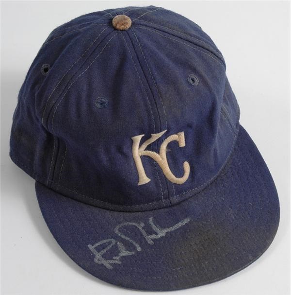 Gibson never gave an inch -- just ask Dennis Eckersely -- and the cap he wore during the '91 season with the Royals is pure Gibson, covered with dirt and lined with sweat. The final touch is his signature on the bill in silver marker (7/10). Underside of the bill has a handwritten "30". New Era label and Authentic and size-7 tags on interior back.
