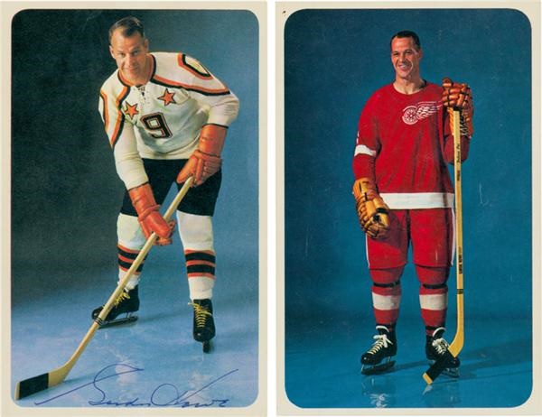 Pair of ad cards from Eaton's sporting goods stores feature single color shots of Howe in an All-Star uniform and his Red Wings duds. Gordie signed the former in blue pen (9/10). Back of the first card has a facial illustration and bills him as "Eaton's Sports Advisor." Both backs have his facsmile signature in a box on bottom. Cards are 3.25 x 5.25" and NRMT with the only flaw a speck on the upper left corner of the Red Wing shot.
