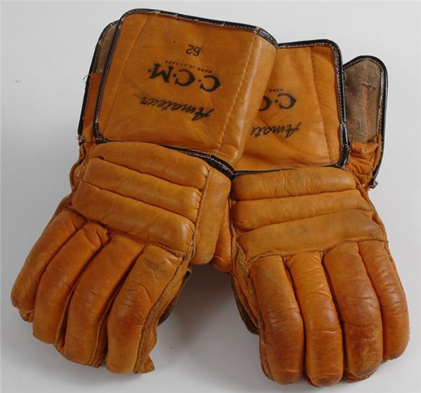 Pair of classic CCM players gloves from the early '60s. Light brown leather gloves are battered and blackened in the pocket from lots of game use. Came from old lot of game used NHL equipment. Old time hockey!!!!!