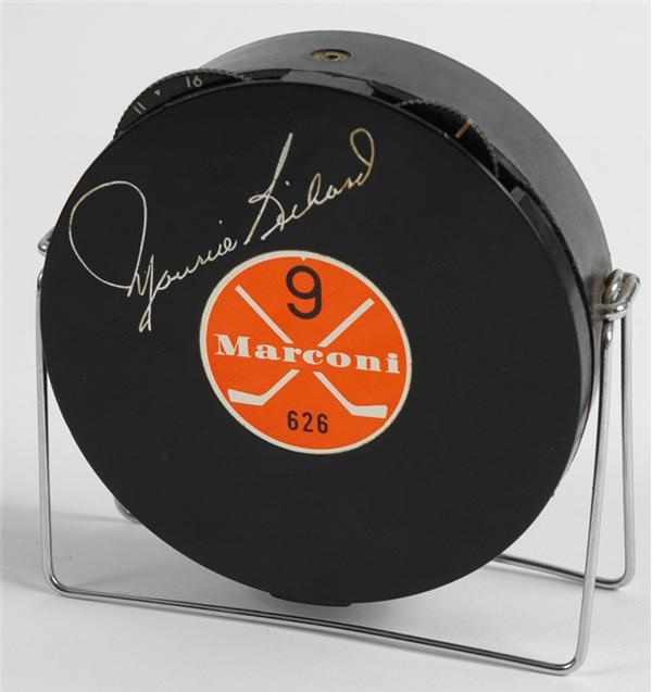 Wonder if "Rocket Man" ever was heard on this nifty puck-shaped radio. The hockey great's facsmile signature "Maurice Richard" races across the top above a red circular middle area with his famous No. 9, crossed sticks, the manufacturer's name "Marconi", and "626" (apparently the model no. since he scored 544 goals). Japanese-made transistor radio that ran on a 9-volt battery has a tuner and on/off switch on top and is mounted between silver "goal posts" that allow it to swivel a bit. Radio is 4" in diameter and EX.