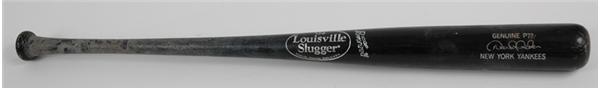 Offered here is a very fine example of one of Derek Jeter's game used bats. This is a "powerized Louisville Slugger model 125 genuine P72 Jeter model bat. It show very nice game wear, from looking at the barrel of the bat one can see the Yankee Captain made some nice contact with this piece of lumber. The tape around the handle has been removed. It appears to have gone up the barrel of the bat 13". The bat measures 34". There are two 8" cracks just below the Louisville Slugger emblem. With a $200 opening bid it would be hard to find a nicer game used Jeter bat at a lower price.