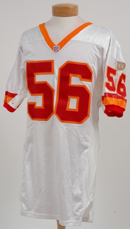 The hardy linebacker played 15 gritty seasons, being issued this mouth-watering Bucs jersey in '96. "56" on front, back and sleeves, ""Nickerson" across back and sleeves, piping all in red/orange tackle twill. Wilson tag in collar with size-44 flag tag and "96 label. Unused and almost silky to the touch.