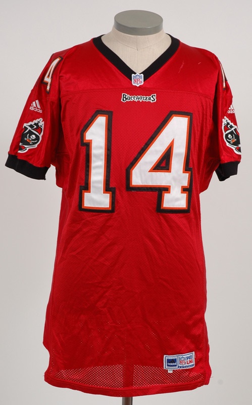 The nomadic QB has had some huge years for the Bucs, throwing 26 TDs in 2003. This is one of his game-issued Bucs jerseys. Ruby red with "14" on front, back and sleeves in white/orange/black tackle twill, "B. Johnson" across back in white. "Buccaneers" in b&w under NFL logo in V-neck. Team patch on left sleeve. Adidas Pro Line tag on hem with size-48 flag tag. Unused, bright and sharp.