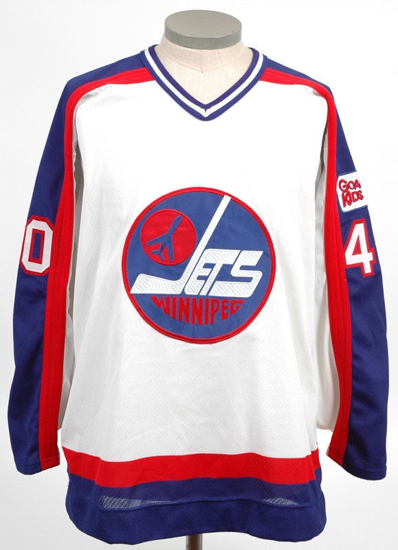 The goalie chosen by the Jets in the '88 draft was 'tween the pipes for parts of 4 seasons with the club, from 1989-92 and '93-94. He donned this soon to be history Winnipeg jersey for some of that span. White mesh jersey has the team logo in red, white & blue on the chest, "Beauregard" on back and "40" in blue-red tackle twill on back and on both sleeves in white-red. "Goals for Kids" patch on left sleeve. Maska tag w/size "52" written on it. CCM on hem. Fight straps intact. Light use.