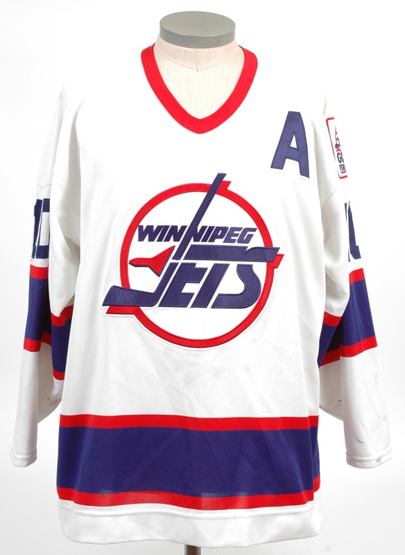 The Russian center came right from the Moscow Dynamo national team to the Winnipeg Jets in 1992, and put in four seasons before the team went under and he moved on to the Blackhawks. This classic white Jets jersey worn by Zhamnov has the alternate captain's "A" in blue on the left shoulder above the team's blue and red logo, "Zhamnov" on back and "10" on back and both sleeves. Team's "Golas for Kids" patch on left sleeve. Maska tag and size "52" flag tag in collar. CCM on back hem. Moderate but evident use with some souvenir stick marks on the front.