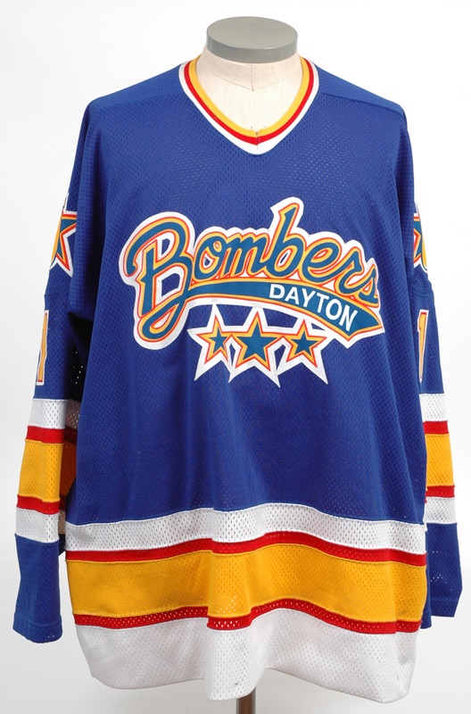 The Western Michigan University goalie hit the ice with the ECHL's Dayton Bombers in '95-96, going 6-5-3 w/a nifty 3.09 GAA. Unique blue mesh jersey that he wore that season has a multi-colored "Bombers " splashed like fruit salad across the chest with 3 stars underneath. "Renfrew" on back in white and "1" on back and both sleeves in gold/red/white. Bomb-on-star patch on both sleeves. McCarthy-Sorenson [size] XXXL tag sewn into back hem. Hockey or roller derby?