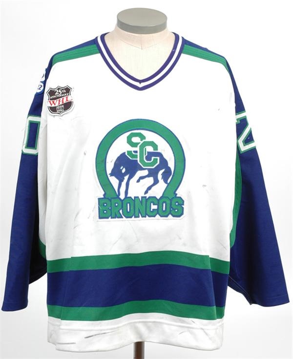 1991 jersey worn by a gung-ho member of the WHL's Swift Current (Saskatchewan) Broncos, who won the Memorial Cup title in '89. White shirt has bucking bronco logo in blue and green across the front, "20" in blue/green tackle twill on back and on both sleeves in green/white. Memorial clover-shaped patch on right sleeve with the numbers of the 4 players who died in a 1986 team bus crash. 25th anniversary patch on right shoulder. CCM and CHL logos on back hem. Maska tag and size "52" flag tag in collar. Fight straps intact. Extensive wear with a plethora of markings.