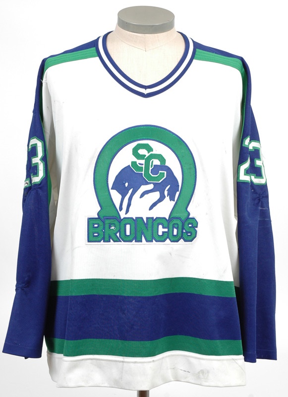 Swift Current Broncos jersey from the star-crossed WHL team that won a Memorial Cup in '89 three years after four of its players were killed in a team bus accident. White jersey has bucking bronco logo on front and number "23" on back in green and blue and number on both sleeves in white and green. Memorial clover patch has the numbers of the 4 deceased players -- 8, 9, 11 & 22. CCM and CHL logos on hem. Fight straps intact. Maska tag and size "56" flag tag in collar. Extensive use with rips, team repairs and stick marks just about everywhere.
