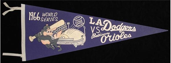 Super clean felt pennant is highlighted by solid text and images including that of the beloved Baltimore Oriole. Minor toning and fading from age give it that oh-so nice vintage look, EX+-EX-MT. Great piece from the O's World Series sweep of '66.