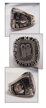 Salesman's sample is the blueprint used to create the rings for the N.B.A. Champs. Face has two zirconia-studded baskets and balls surrounded by raised text, "94-95 Rockets World Champions." Left shank has star "Olajuwon"'s name above a rocket logo. Right shank has NBA logo and "Back 2 Back" slogan. Size 11.5.
