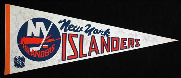 Sixteen different Islanders have autographed this 30" wool felt pennant in blue ink including fan favorites Trottier, Westfall, Merrick, Kollur, Bossy, Ptvin, Lorimer, Bourne, Gillies, Persson, Smith, and Resch. All signatures are NR-MT or better, pennant with pinholes is EX-MT.