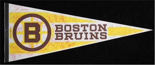 Wool felt pennant (30") signed by a dozen Bruins including Bob Sweeney, Tom Johnson, Al Pederson, Glen Wesley, Jay Miller, Cam Neely, Doug Keans, Mike Milbury, Reggie Lemelin, John Bucyk, and Michael Thelvin. Overall autographs grade NR-MT. Pennant has expected pinholes, EX-MT.