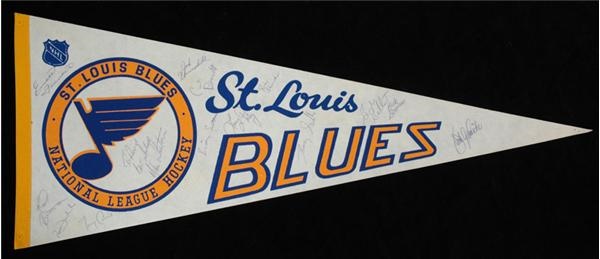 Fourteen NR-MT blue ink signatures include: Federko, Currie, Sutter, Brownschidle, Patey, and Bowness. Pennant, with pinholes and mild creasing near tip, is EX-MT.