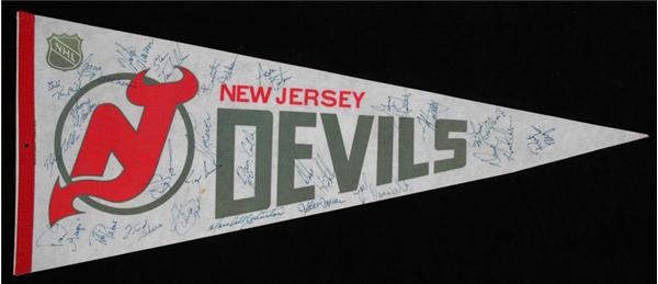 Twenty four blue felt tip autographs include: Broten, Lever, MacMillan, Levo, Ashton, Marini, Middlebrook, Tambellini, Palmer, and Hutchison. Overall NRMT+. Wool felt pennant with pinholes and mild creasing near tip, EX-MT.