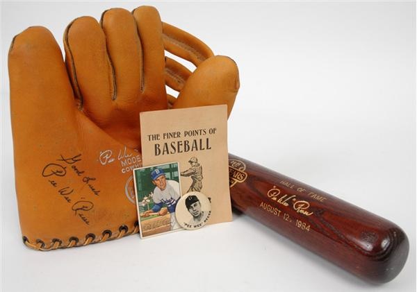 Great lot of Pee Wee bric-a-"bat" includes: 1) Store model Reese Em-Jay fielder's glove in original box. Mitt signed, "Good luck, 'Pee Wee' Reese" in black marker (9/10). Lightly used and VG, brown-red box G w/ damage. 2) Repro 1952 Bowman card, image slightly crooked, VG-EX. 3) Original Pee Wee souvenir button, 1 7/8" in diameter, G w/rusting on pin side. 4) Vintage "Finer Points of Baseball" pamphlet, VG-EX. 5) HOF induction bat dated August 12, 1984. Reese model Louisville Slugger (34") has a cherrywood coating with gold lettering, is NRMT and gorgeous.