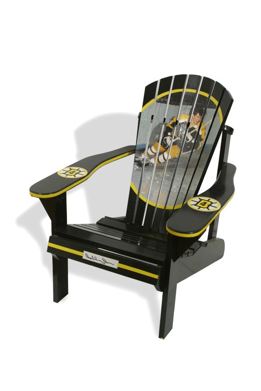 One of a kind chair with the image of hockey's greatest all around player was a 1st place prize at Orr's annual Beanpot Benefit Golf Tournament, held from 1997-2003 at the Willowbend Golf Course in Mashpee, Massachusetts. Wooden lawn style chair is painted in the Bruins color scheme of black with yellow trim. Orr's image in his Bruin uniform is against the back slats, making it seem almost fleeting, like artwork on an unfurled fan. On each arm is a Bruin logo with "4". Orr's MT signature in black marker is on a label affixed to the front slat. Chair is in Mint condition with just a small chip on one of the seat slats.