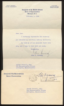 Neatly typed letter in blue ink on Official Congress of the United States stationery. This February, 1952 "Dear Joe" letter is nicely signed by J.F.K. VG+.