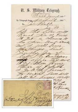 Amazing collection of Civil Wart documents from James G. Cooper, a Union Army soldier from the Pittsburgh area. Written to his parents. There are a total of forty-nine letters here. The content of the letters spans the breadth of the War from 1861-1865. They are all military and historical in nature with such content as Abraham Lincoln's assassination, gritty battle detail including Rebels approaching with a flag of truce and then firing upon them, spying, Gettysburg, Copperheads, Grant defeating Lee, General Sherman, Picket, Mason-Dixon Line, and General Robert E. Lee's Surrender. An early train that went off the tracks and then crashed into his men. There is even one letter that includes a piece of Tennessee cotton that was included in the envelope with reference to it in the letter (this is analogous to what the War was fought for). Many have the original envelopes with original stamps and postmarks. One letter is even on red, white & blue "The Shield" stationery with American Stars and Bars emblem: "1776-1861." Most of the letters have been transcribed for easy research and enjoyment. Plus, there is a complete 1864 Civil War leather bound diary with compelling content, 1897 Encampment #1 Civil War Veteran's Legion receipt & figural metal membership badge, plus a small ad flyer, 1861 bank receipt & 1864 signed receipt. Overall excellent. This represents a complete documentation of the Civil War through the eyes of a man who fought it. It is an unparalleled piece of fascinating history.