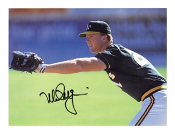 Daring image of McGwire with impressionistic background of green field and blue scoreboard/wall. Signed on the green in Mint black. From his cherished days in Oakland. Mint.