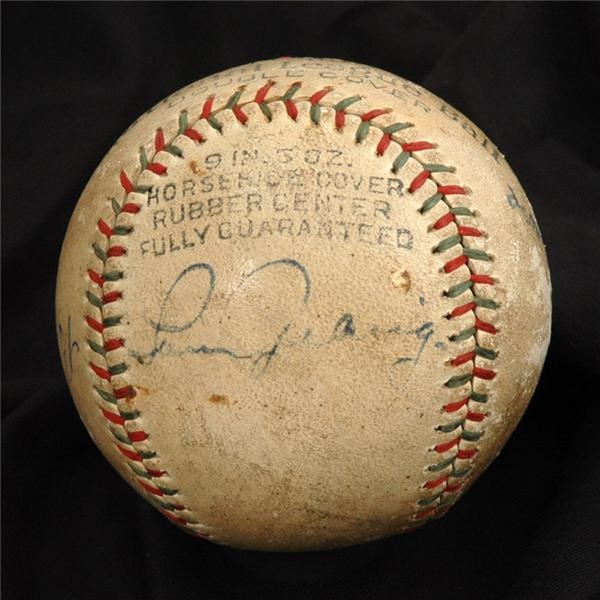 Not only a Babe Ruth/Lou Gehrig signed ball -- among the very elite of sports collectibles under any circumstances -- but one with the added punch of actually being dated and thus traceable to a particular game. In this case, not a big league affair but one far more arcane and fascinating -- the "Oct. 28 - 1928" and stamping of "Harwood's National League Ball" (not the official NL ball) pegging it as being used in a post-season barnstorming tour in the hinterlands. These tours had a lure and history all their own, as scores of underpaid big leaguers took to the back roads (some under assumed names when their teams objected to them playing for anyone else) to make a few bucks. Some of these games were against traveling Negro League All-Stars, who more than money relished the chance to show up the white big leaguers. While the game this ball came from is unknown, it's more than enough given the paucity of surviving memorabilia from the barnstorming days to make it a real historical bauble. As for the gods' signatures, Ruth's sits on one panel and Gehrig's on another, both in blue ink that has understandably faded a bit yet remain vivid and strong, with carefree loops and arcs of the 1st letters of each of their names. Both grade solid 6's. Another bonus is that signature of fellow HOFer Al Simmons on the opposite end of the Ruth panel, also a 6. The dated inscription is at the bottom of a notation "Hit by R. Schenner" (identity unknown), with this ink flow bolder. The ball itself has held up nicely, with an even tan-grey tone and just a few splotches of soiling and surface loss. A beaut. And what a price!