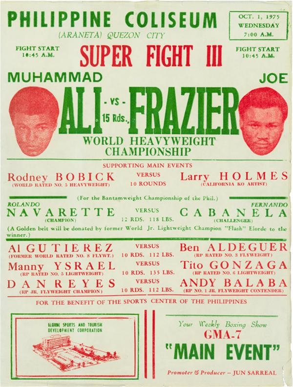 9 x 12" Philippines broadside for the Ali-Frazier "Thrilla in Manila", the 3rd in their blood-feud ring wars that left a battered Frazier on his stool after round 14 and Ali victorious but half-dead. Striking red images of the fighters' faces frame "Super Fight III, World Heavyweight Championship" in green, other lettering for the site and undercard in green and red. Ali big-fight posters are always in demand, and this is one of the more unique "Thrilla" ones. Technically VG-EX for serating/tearing on right edge but displays brilliantly.