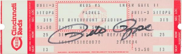 Own a piece of baseball "hit-story!" This ticket is signed on the very date Pete Rose broke the all-time major league hit record of 4,192, exceeding Hall of Famer Ty Cobb's record of 4,191. This whole, pristine ticket has "Charlie Hustle's" scrawl captured perfectly in permanent black ink against a red background. "The Reds vs Padres at Riverfront Stadium", as well as all other pertinent ticket information, is clearly preserved.