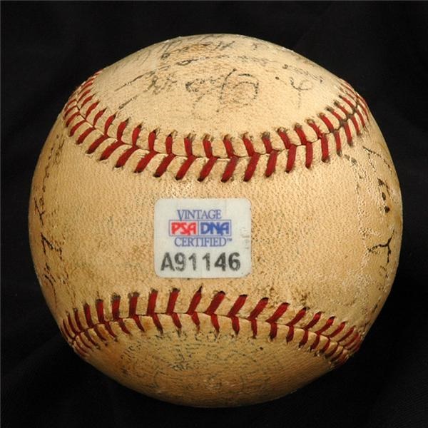 This shimmering gem from the Yankee mineshaft of history boasts signatures of some pinstriped gods. From 1937, which was a virtual reply of '36 when the Pinstripers stormed through the AL then destroyed the crosstown Giants in the World Series. The post-Ruth mantle of leadership fell on Lou Gehrig and the young Joe DiMaggio, who came through with typically brilliant seasons, hitting .351 and .446, respectively. It was also Joe D's high-water mark for homers, with 46. Gehrig is on a side panel an inch or so from the sweet-spot marker of manager Joe McCarthy, whose autograph is the best, a 7/10 compared with the Iron Horse's somewhat faded 6. Joe D's, also on a side panel, grades a faded 5/10. Approx. 22 signatures in all -- McCarthy appears to have signed twice -- with about half discernible, including other HOFers Rolfe, Ruffing & Tony Lazzeri, as well as Selkirk, Pearson, Hoag, Hadley, etc. Also the Giants' Jimmie Ripple. PSA-certified ball G-VG with stampings rubbed off and a nice gold tone with some dirt spots. COA.