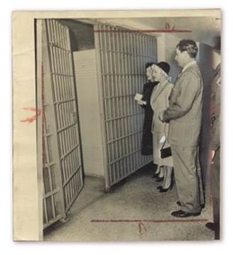 Image of actor Mitchum entering his cell after 60-day sentence after he was busted for smoking "marijuana." He is with partner in crime actress Lila Leeds. Dated February 10, 1949. Publishing marks on the front and some creases o/w EX. 8x8.5".