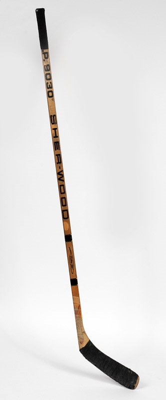 Mark Messier's Sherwood stick from 1983-84 season is authentically worn by lots of play time, the tape on the blade is battled and torn on the bottom, and black taped with sweat on the knob. His teammates' signatures from the Edmonton Oilers are faint and strategically marked along the one side of the shaft.