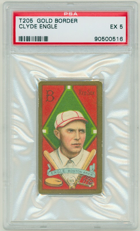 A sharp looking T205 card of Clyde Engle. This example has amazing coloring to it, bright green, red and gold colors make this one nice PSA 5 card.