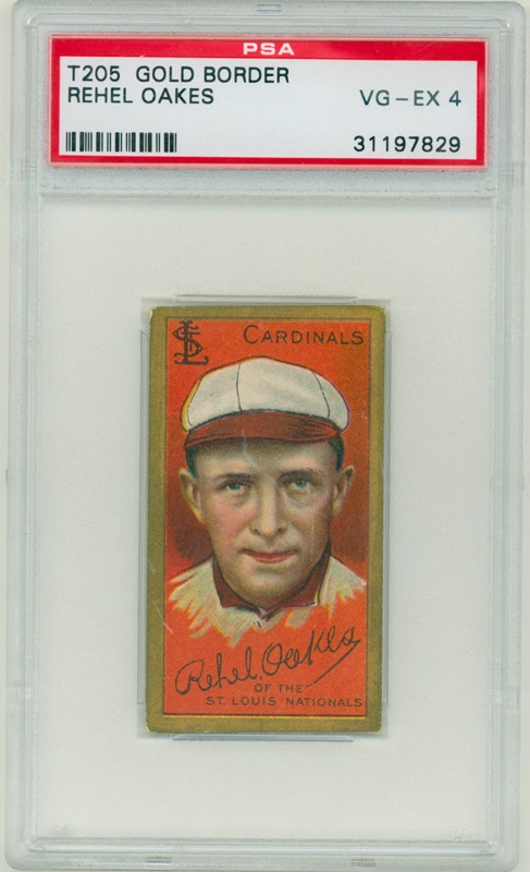 Vibrant red and orange colors combine to make this front "pop". Slight rounding of corners and back of card off-centering and age discoloring are evident. Could easily grade higher.