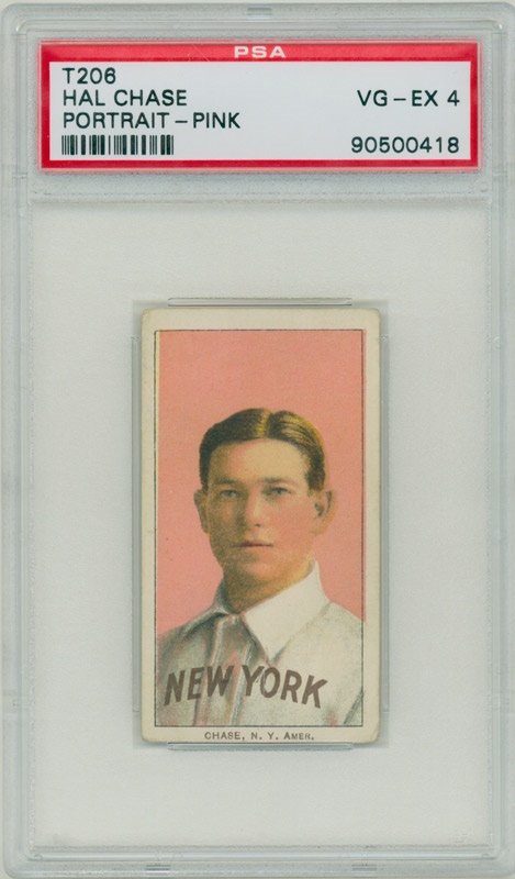 Vibrant pink background fills this portrait card. Corners show rounding. Back is off-center right. and shows slight age discoloring.Could easily grade higher.