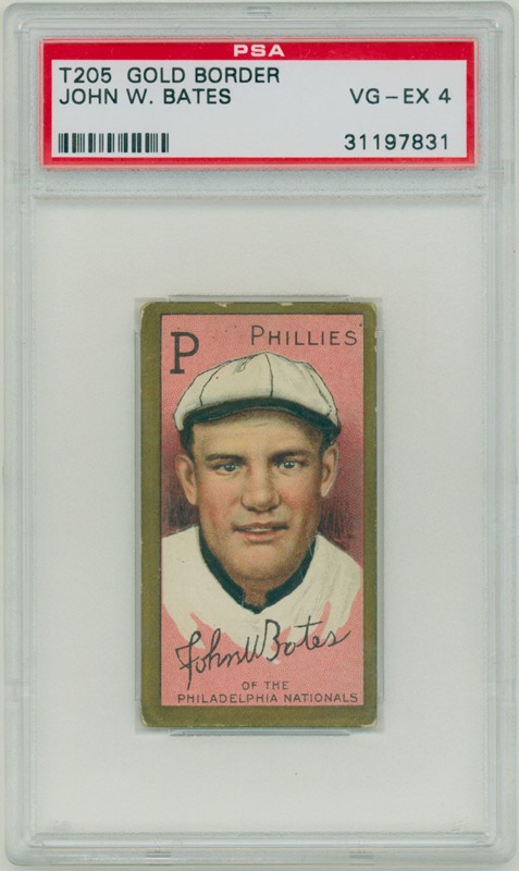 Pink and black color combination still shows vibrant on this early tobacco card. Corners show rounding and missing specks of gold. Back shows age discoloring. Could easily grade higher.