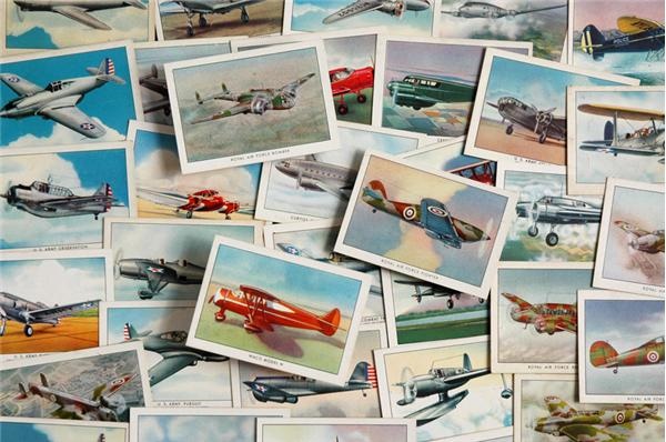 Impressive horde of 150+ cards from all three Wings Tobacco Cards T87 series, A, B & C, issued from 1940-42 by the Brown & Williamosn Tobacco Corp. in conjunction with a radio program it sponsored called "Wings of Destiny". 1.5 x 2.5" cards featuring various aircraft from around the world were issued with tobacco products and usually were glued to albums, damaging many of them. This great lot, however, is free of such damage, with most amazingly NRMT, with only some bearing small specks or border/corner wear.