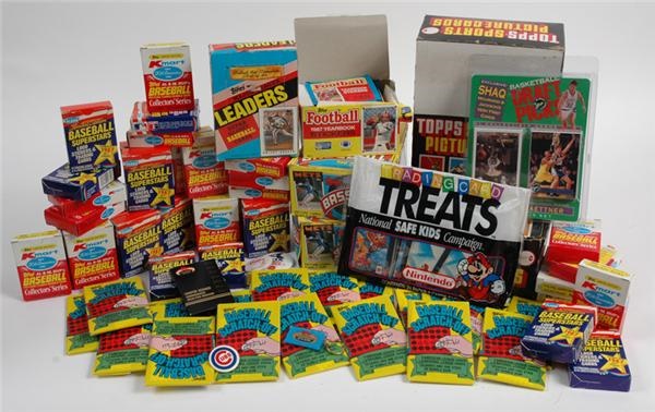 Huge collection of over fifty (50) wax boxes and sets from 1980's-early 1990's. Collection includes: two boxes (2) 1986 Topps; 1986 Topps Rack Pack Box; 1987 Topps Rack Pack Box; thirty-three (33) 1987 Fleer Limited Edition Sets; twenty two (22) 1982 Topps Kmart 20th Anniversary sets; a box of 1987 Topps Football Stickers; a box of 1986 Topps Major League Super Glossy cards; 1992 set of Classic Basketball Draft Picks w/ Christian Laettner and a Topps Stadium Club Charter Member Gold Medallion.