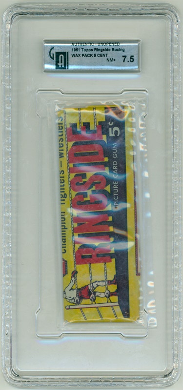 Very scarce unopened wax pack of the only boxing set ever produced by The Topps Company. Penny packs are tough to find but nickel packs are almost impossible to locate! The set was made for all-time greats and the highlights include Jake La Motta, Jersey Joe Walcott, Tiger Flowers, Sugar Ray Robinson, Joe Louis, Marciano, etc. Pack is graded GAI 7.5 NRMT+. A must have pack for any serious unopened collection.