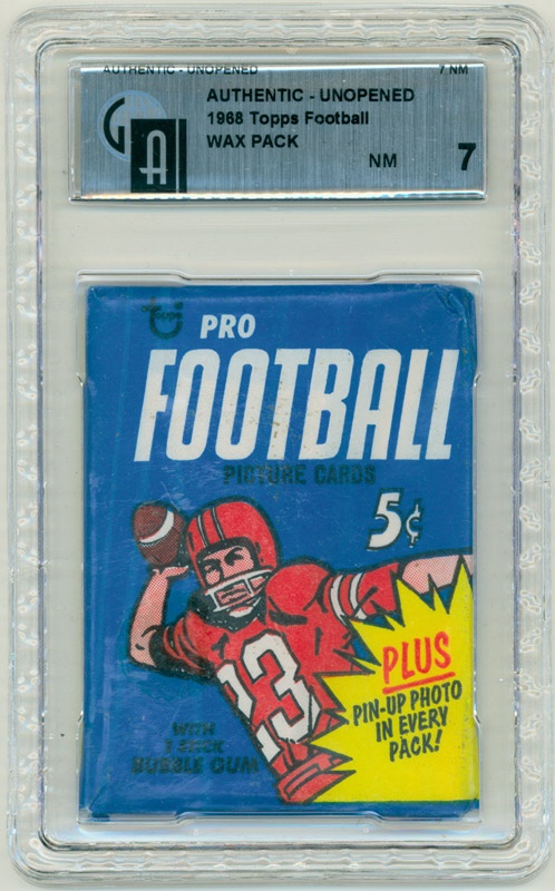 This unopened 1968 Topps Football wax pack grades GAI 7 NRMT. Possible pulls include: Joe Namath, Gale Sayers, Jack Kemp and Bob Griese's Rookie Card amongst others.