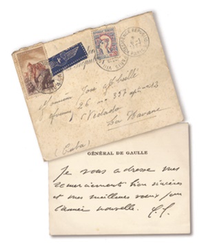 Handwritten note, scripted in black ink, by Charles de Gaulle, 18th President of France. Written in French on "General De Gaulle" letterhead, de Gaulle writes to a Cuban official regarding Great Britain's entry into the Common Market at the time. Simply initialed "C. G." Both the initials and text are boldly penned and grade 9/10 overall. Although the note it not dated, it is accompanied by its original mailing envelope bearing a French postmark of "6-1 1967." The note (4.5 x 3.5") displays a few light creases and is in Excellent condition. The envelope (4.75 x 3.5") remains in Very Good condition. Full LOA from PSA.