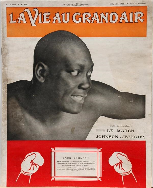 LaVieau Grandair magazine features bust shot of Jack Johnson on the cover, with five page spread with round by round info and photos from his battle with Jeffries. These pages have come apart from binding. Also includes a centerspread with photographs of the action in the ring. This centerspread is still intact. Good condition overall.