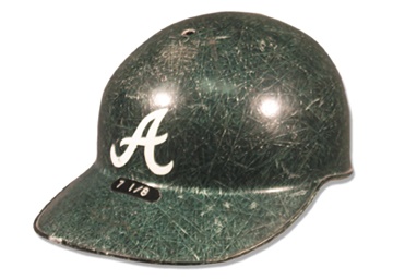Classic flapless style from the Braves dugout during the days of the great Hank Aaron. Helmet shows great use, with pen notation, "Wed. Sept 9, 1970," on the label inside. Size "7 1/8" sticker affixed to visor. From a longtime hobbyist.
