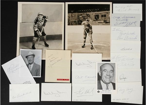Very nice compilation of mostly 70-80's cut autographs featuring hundreds of NHL players, coaches and refs. A small sampling penned in ink include Keon, Mahovilich, Howell, Roger Crozier, Giacomin, Vickers, Boom Boom Geoffrion, Ratelle, and Sid Abel. There is quite a number of HOFer's the like of Bobby Orr (3), Jaques Plante, Frank Brimsek, Babe Pratt, Bill Mosienko, Eddie Shore and many more. Also included are some vintage photos and a 1979 WHA letter signed WHA President Howard Baldwin. This collection took years to compile and comprises a nice slice of NHL history.