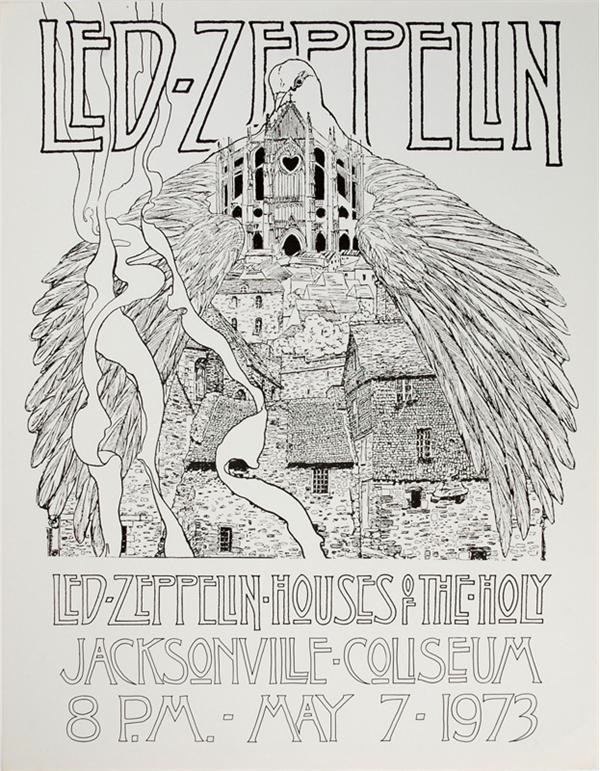 Zeppelin broke into the rock and roll penthouse (which they no doubt trashed) with the 1973 "Houses of the Holy" LP, pushing the limits defining rock and metal. That year's U.S. tour in support of the album, which broke all rock attendance records, echoes in this fabulous poster for a May 7 show in Jacksonville. It features a typical Zep motif of Gothic and occultish images in a pen and ink drawing, with a giant condor draping a "house of the holy" under its massive wings and "Led Zeppelin" splashed across the top in skeletal lettering. 17.5 x 22.5" and VG-EX with some yellow foxing on lower left border though o/a clean with good crisp edges and corners. A poster that's gonna make you burn, gonna make you sting.